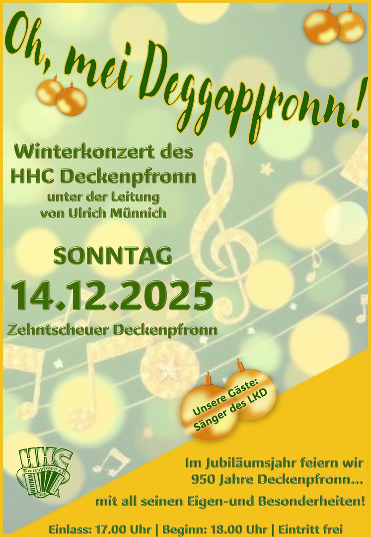 Der HHC Deckenpfronn lädt herzlich zum diesjährigen Winterkonzert ein, das im Zeichen des Jubiläumsjahrs stehen wird. Wir feiern 950 Jahre Deckenpfronn… mit all seinen Eigen-und Besonderheiten!