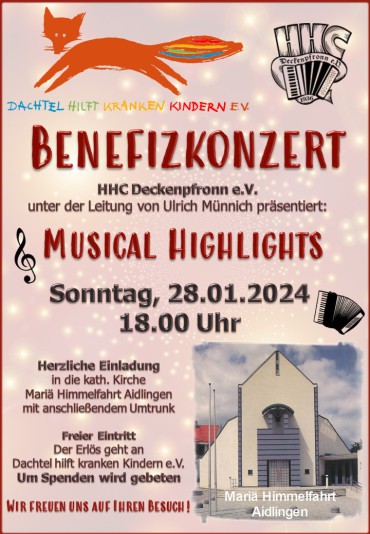 Gemeinsam mit dem Verein Dachtel hilft kranken Kindern e.V. veranstaltet der HHC am Sonntag, 28. Januar ein Benefiz Konzert in der katholischen Kirche Mariä Himmelfahrt in Aidlingen. Erleben Sie mit uns noch einmal die Melodien aus weltbekannten Musicals und seien Sie dabei, wenn unser Orchester Sie in die wundervolle Welt der Musicals entführt und Sie an den großen Momenten der verschiedensten Broadway-Highlights teilhaben lässt.